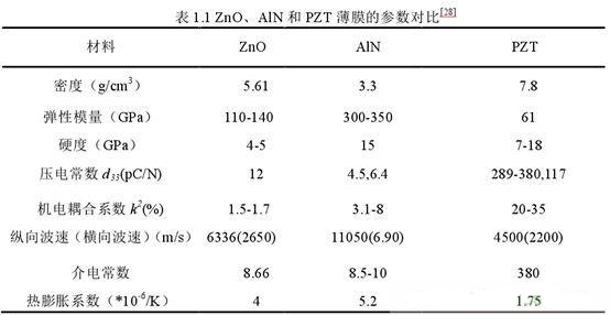 目前應用較為廣泛的壓電薄膜材料主要有氮化鋁AlN)、氧化鋅(ZnO)和 PZT系列的壓電薄膜材料。性能比較如下表所示: