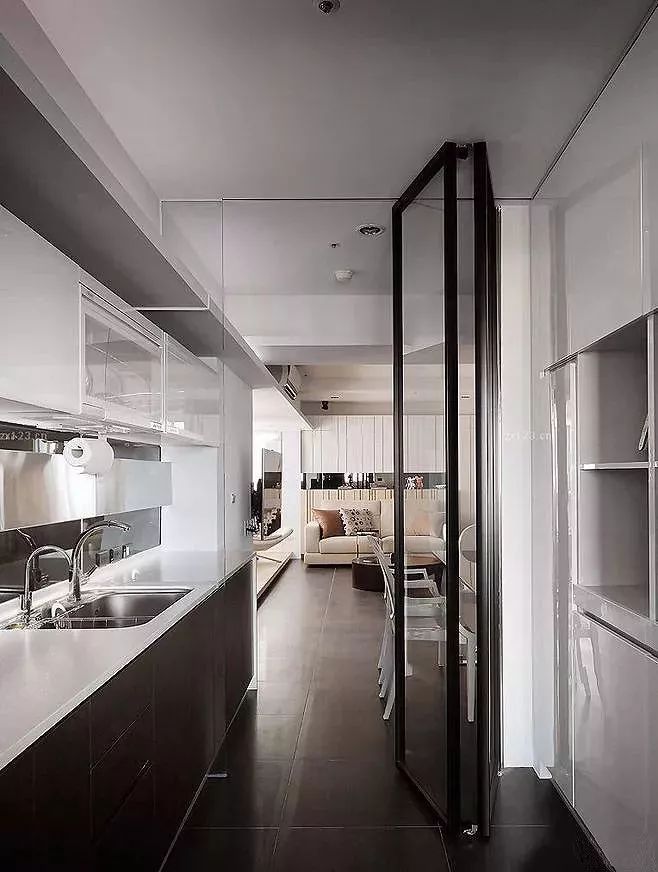 將廚房的折疊門完全收起后,基本上就不占位置了,既能達到開放式廚房的美觀效果,又能防止油煙的進入。