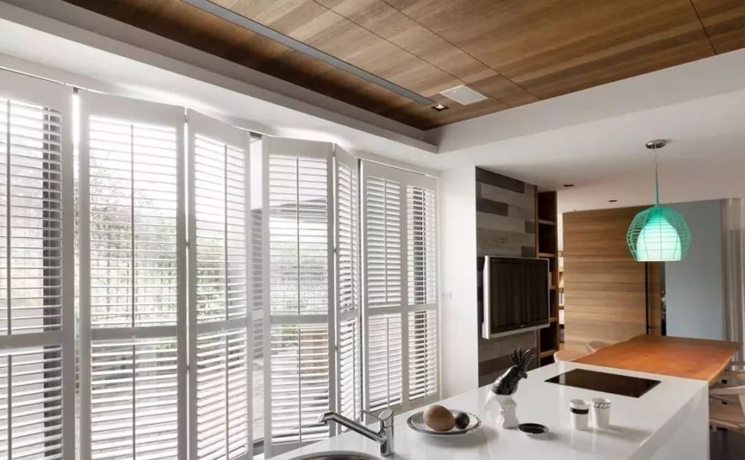 如上圖所示,百葉簾采用折疊門設計,能更有效地保障私密性,不需再配上窗簾和紗簾,陽臺透過百葉簾,也會更加柔和舒適。