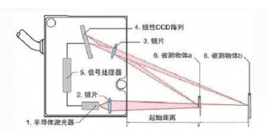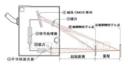 半導(dǎo)體激光器①被鏡片②聚焦到被測物體⑥。反射光被鏡片③收集,投射到CMOS陣列④上;信號處理器⑤通過三角函數(shù)計算陣列④上的光點(diǎn)位置得到距物體的距離。